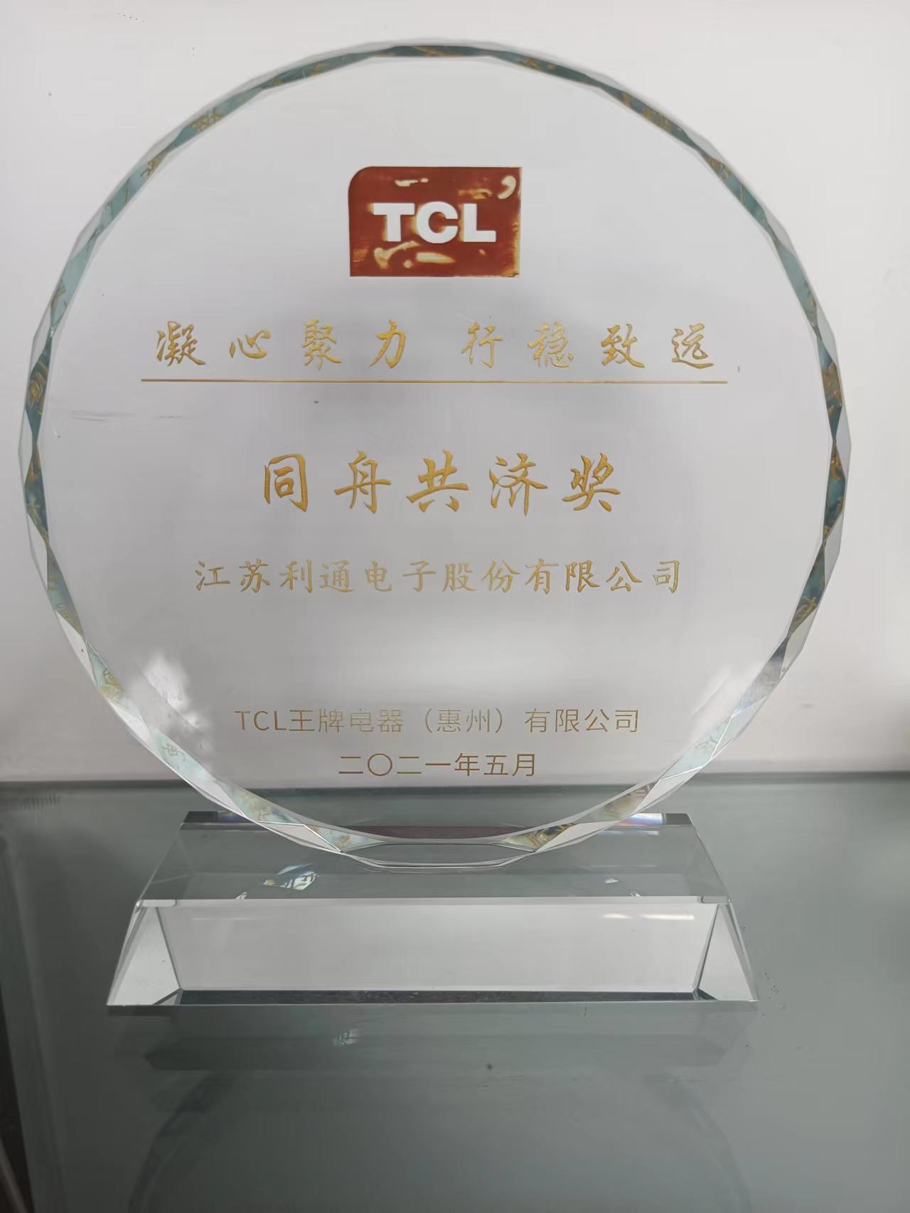 被授予2021年度TCL王牌电器(惠州)有限公司“同舟共济奖”